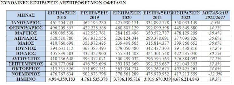 Σε ό,τι αφορά στις εισπράξεις (εξαιρουμένων των μη φορολογικών κατηγοριών), αυτές το 2022 έφτασαν τα 220 εκατ. ευρώ, ενώ την αντίστοιχη περίοδο το 2021 έφτασαν τα 295 εκατ. ευρώ (μείωση κατά 25,5%).