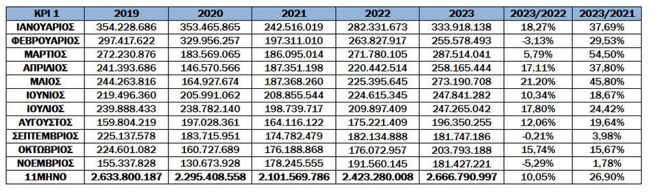 Στο 11μηνο, οι εισπράξεις έναντι των παλαιών ληξιπρόθεσμων άγγιξε τα 2,7 δισ. ευρώ, δηλαδή όσα και την προ πανδημίας περίοδο.