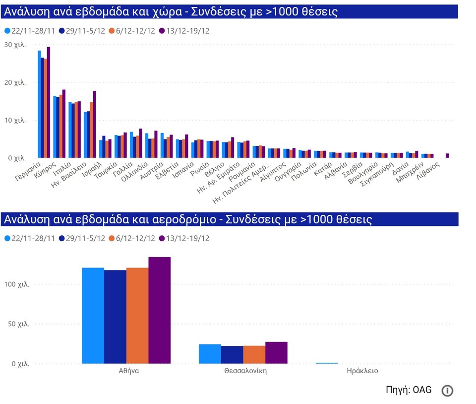 Σύμφωνα με τα στοιχεία από το Παρατηρητήριο του ΙΝΣΕΤΕ, την τρέχουσα εβδομάδα οι προγραμματισμένες θέσεις από διεθνείς πτήσεις είναι αυξημένες κατά 2,4%, ενώ για την επόμενη εβδομάδα καταγράφεται αύξηση 12,9%. Γερμανοί, Κύπριοι, Ιταλοί, Βρετανοί, Ισραηλινοί φαίνεται ότι έχουν προγραμματίσει διακοπές στην Ελλάδα και με ενδιαφέρον αναμένονται τα στοιχεία για την εβδομάδα των Χριστουγέννων. «Η χειμερινή περίοδος έχει διάρκεια 120 ημέρες. Δεν αρκεί για τις συγκεκριμένες επιχειρήσεις μόνο ένα καλό 15νθήμερο που μάλιστα δεν είναι για την ώρα εξασφαλισμένο, ώστε να καταφέρουν να καλύψουν τεράστιες ζημίες 18 μηνών» σημειώνει ο πρόεδρος της ΠΟΞ, χωρίς να κρύβει τον προβληματισμό του.