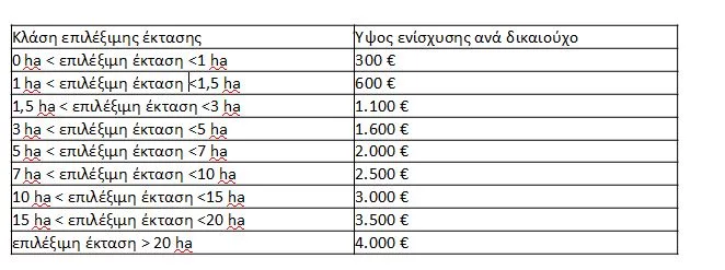 Η οικονομική ενίσχυση χορηγείται εφάπαξ για να αποζημιώσει τους δικαιούχους, λόγω της σοβαρής μείωσης του εισοδήματός τους από τη διατάραξη της ομαλής λειτουργίας της αγοράς, εξαιτίας της πανδημίας COVID-19. Ο υπολογισμός του ύψους ενίσχυσης πραγματοποιείται ανά δικαιούχο σύμφωνα με την κλάση εκταρίων της επιλέξιμης έκτασης. Το ύψος ενίσχυσης για κάθε κλάση επιλέξιμης έκτασης ορίζεται κατ' ανώτατο όριο ως εξής: