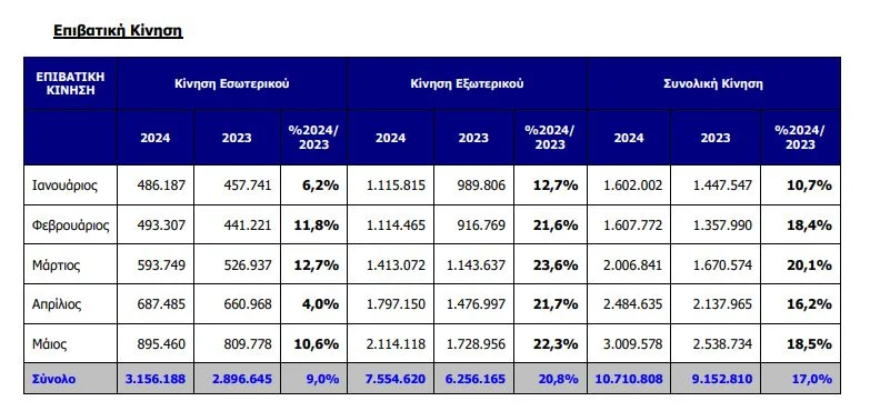 Συγκεκριμένα, η επιβατική κίνηση του αεροδρομίου της Αθήνας κατά την διάρκεια του Μαΐου 2024 ανήλθε σε 3.01 εκατ., αυξημένη κατά 18,5% σε σύγκριση με τα επίπεδα του Μαΐου 2023.