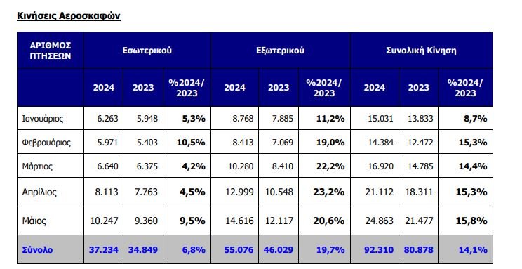 Ο αριθμός των πτήσεων στον Διεθνή Αερολιμένα Αθηνών κατά τη διάρκεια των πέντε πρώτων μηνών του 2024 ανήλθε σε 92.310, καταγράφοντας αύξηση της τάξης του 14,1% σε σχέση με την αντίστοιχη περίοδο του 2023.