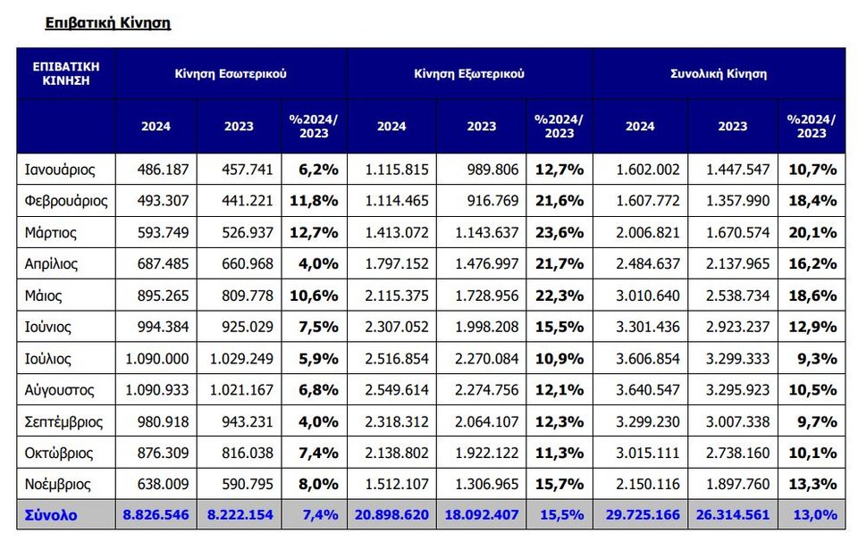 Τόσο οι πτήσεις εσωτερικού όσο και οι διεθνείς πτήσεις σημείωσαν άνοδο κατά 5,1% και 15,4% σε σχέση με το 2023.