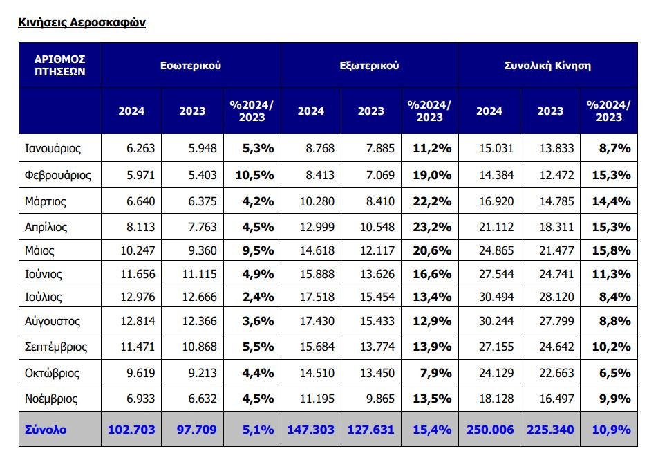 Ο αριθμός των πτήσεων στον Διεθνή Αερολιμένα Αθηνών κατά τη διάρκεια των ένδεκα πρώτων μηνών του 2024 ανήλθε σε 250.006, καταγράφοντας αύξηση της τάξης του 10,9% σε σχέση με την αντίστοιχη περίοδο του 2023.