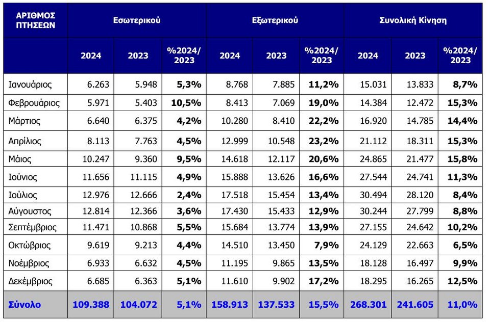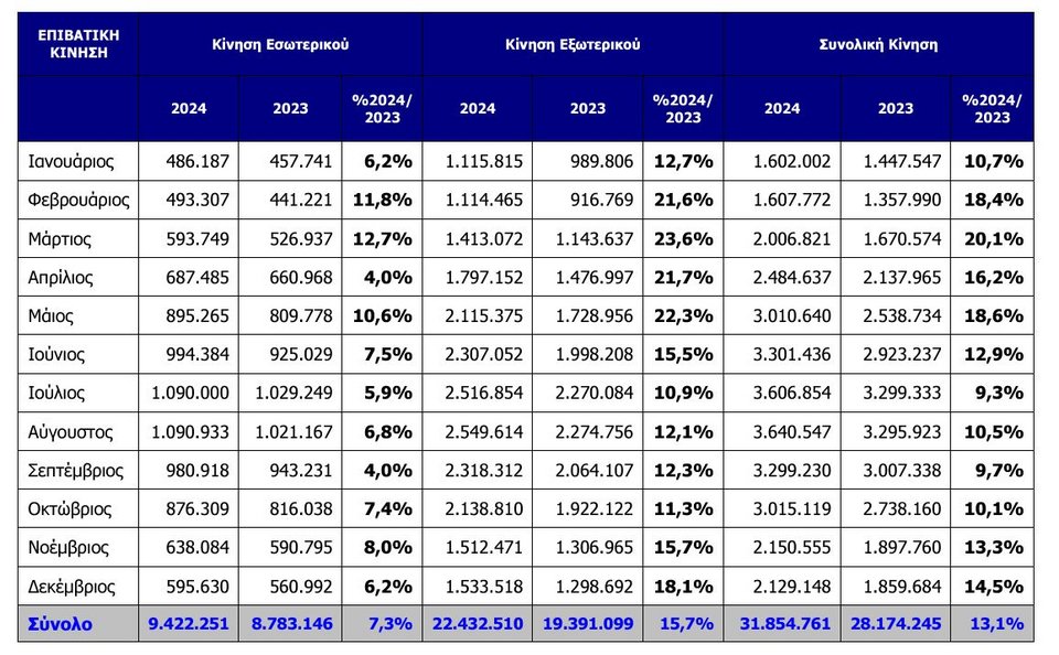 Σημείωση: Τα στατιστικά κίνησης του Δεκεμβρίου 2024 είναι προκαταρκτικά και ενδέχεται να αλλάξουν. Τα στοιχεία κίνησης του κάθε μήνα οριστικοποιούνται μετά την 20η του επόμενου μήνα.
