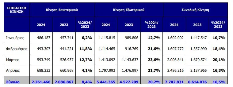 Τα στατιστικά κίνησης του Απριλίου 2024 είναι προκαταρκτικά και ενδέχεται να αλλάξουν. Τα στοιχεία κίνησης του κάθε μήνα οριστικοποιούνται μετά την 20 η του επόμενου μήνα.