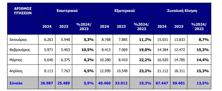 Ο αριθμός των πτήσεων στον Διεθνή Αερολιμένα Αθηνών κατά τη διάρκεια των τεσσάρων πρώτων μηνών του 2024 ανήλθε σε 67.447, καταγράφοντας αύξηση της τάξης του 13,5% σε σχέση με την αντίστοιχη περίοδο του 2023. Τόσο οι πτήσεις εσωτερικού όσο και οι διεθνείς πτήσεις σημείωσαν άνοδο κατά 5,9% και 19,3% σε σχέση με το 2023.