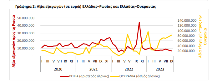 Η αξία των εξαγωγών της Ελλάδας προς την Ουκρανία την περίοδο Ιανουαρίου-Σεπτεμβρίου 2023 ανήλθε σε 536,5 εκατ. ευρώ, σημειώνοντας αύξηση 141,0% σε σχέση με την περίοδο Ιανουαρίου-Σεπτεμβρίου 2022 που ήταν 222,6 εκατ. ευρώ. Το εμπορικό ισοζύγιο Ελλάδας-Ουκρανίας την περίοδο Ιανουαρίου-Σεπτεμβρίου 2023 ήταν θετικό και ανήλθε σε 325,8 εκατ. ευρώ (πλεόνασμα).