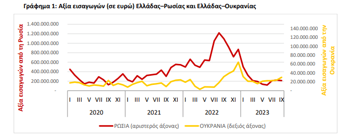 Την περίοδο Ιανουαρίου-Σεπτεμβρίου 2023 η αξία των εισαγωγών της Ελλάδας από την Ουκρανία ανήλθε σε 210,7 εκατ. ευρώ, σημειώνοντας αύξηση 58,8% σε σχέση με την περίοδο Ιανουαρίου-Σεπτεμβρίου 2022 που ήταν 132,6 εκατ. ευρώ.