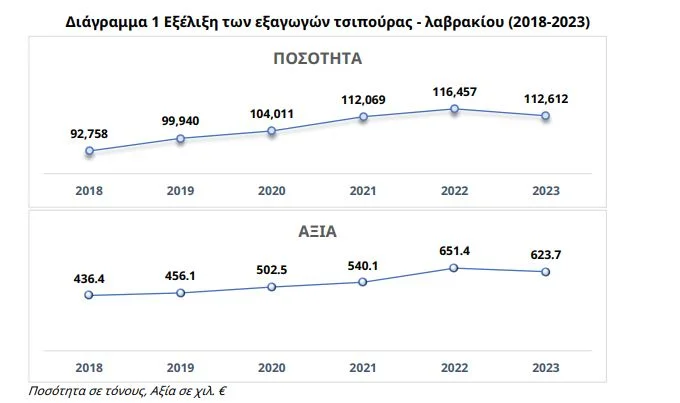 Οι εξαγόμενες ποσότητες τσιπούρας και λαβρακίου σημείωσαν μείωση 3,3% το 2023, ύστερα από συνεχή ανοδική πορεία που ακολούθησαν την προηγούμενη 5ετία (2018- 2022). Οι έντονες πληθωριστικές πιέσεις που ασκούνται τόσο στην εγχώρια όσο και στην ευρωπαϊκή αγορά τα τελευταία χρόνια, συμπιέζουν σημαντικά την αγοραστική δύναμη των καταναλωτών, οι οποίοι στρέφονται σε φτηνότερα προϊόντα, επηρεάζοντας και την πορεία των ελληνικών εξαγωγών.
