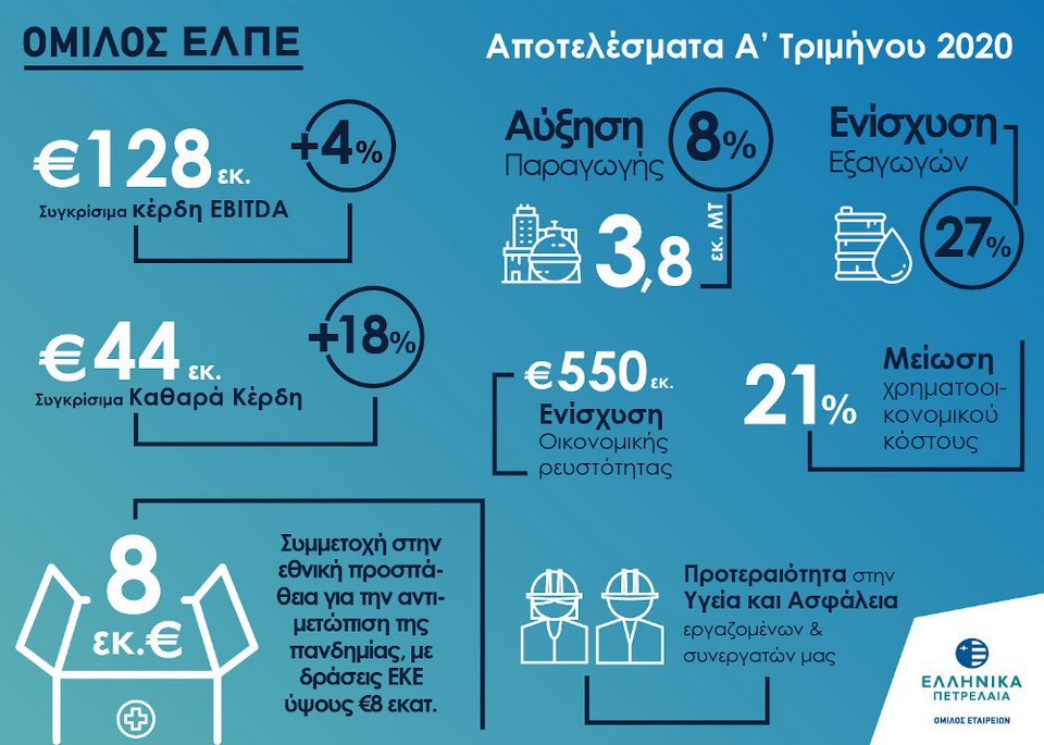 Σε ένα περιβάλλον διύλισης που χαρακτηρίστηκε από έντονη μεταβλητότητα και επηρεάστηκε από την πανδημία covid-19, ειδικά προς το τέλος του τριμήνου, οι βελτιωμένες επιδόσεις των διυλιστηρίων και της λιανικής εμπορίας, αλλά και η αριστοποίηση εφοδιασμού, αντιστάθμισαν την αρνητική επίπτωση της τιμολόγησης αργού και ενδιαμέσων πρώτων υλών, καθώς και των μειωμένων πωλήσεων εσωτερικής αγοράς λόγω covid-19. Η αυξημένη διαθεσιμότητα των μονάδων είχε ως αποτέλεσμα την αύξηση των εξαγωγών κατά 27%, οδηγώντας τις συνολικές πωλήσεις στους 3,9 εκατ. ΜΤ (+9%). Το διυλιστήριο Ασπροπύργου ολοκλήρωσε με επιτυχία το πρώτο πλήρες τρίμηνο σε λειτουργία ΙΜΟ, εξασφαλίζοντας τον εφοδιασμό της αγοράς και διαθέτοντας όλους τους τύπους προϊόντων, με ουσιαστική διαφοροποίηση στο μίγμα κατεργασίας αργών και προσαρμογές σε λειτουργία και κεφάλαιο κίνησης.
