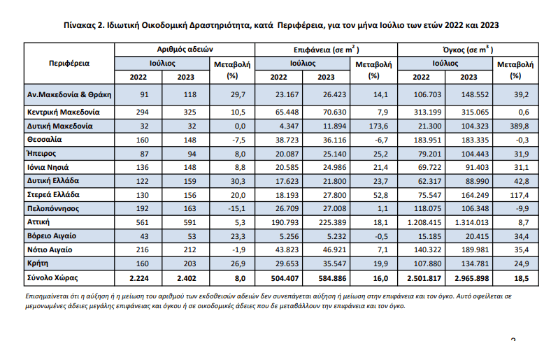Οι εκδοθείσες άδειες Ιδιωτικής Οικοδομικής Δραστηριότητας, στο σύνολο της χώρας, κατά τον μήνα Ιούλιο 2023 ανήλθαν σε 2.402 οικοδομικές άδειες, που αντιστοιχούν σε 584.886 m2 επιφάνειας και 2.965.898 m3 όγκου, παρουσιάζοντας αύξηση κατά 8,0% στον αριθμό των οικοδομικών αδειών, αύξηση κατά 16,0% στην επιφάνεια και αύξηση κατά 18,5% στον όγκο, σε σχέση με τον αντίστοιχο μήνα του 2022.