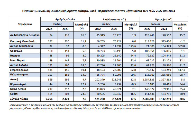 Το μέγεθος της Συνολικής Οικοδομικής Δραστηριότητας (Ιδιωτικής - Δημόσιας), κατά τον μήνα Ιούλιο 2023, στο σύνολο της χώρας με βάση τις εκδοθείσες οικοδομικές άδειες, ανήλθε σε 2.423 οικοδομικές άδειες, που αντιστοιχούν σε 612.421 m2επιφάνειας και 3.112.259 m3 όγκου, παρουσίασε δηλαδή, αύξηση κατά 7,5% στον αριθμό των οικοδομικών αδειών, αύξηση κατά 17,5% στην επιφάνεια και αύξηση κατά 20,6% στον όγκο, σε σχέση με τον αντίστοιχο μήνα του 2022.
