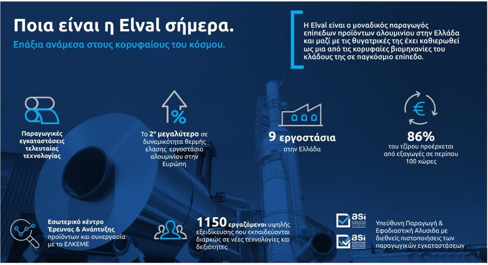 Η Elval αποτελεί τον τομέα έλασης αλουμινίου της ElvalHalcor Α.Ε. και είναι μια από τις κορυφαίες βιομηχανίες του κλάδου αλουμινίου, παγκοσμίως. Για σχεδόν 50 χρόνια, η Elval αναγνωρίζεται ως ένας αξιόπιστος συνεργάτης και πρωτοπόρος παραγωγός πλατέων προϊόντων αλουμινίου, με ευρύ χαρτοφυλάκιο προϊόντων υψηλής ποιότητας για αγορές όπως η συσκευασία, οι κατασκευές, η ναυπηγική, η αυτοκινητοβιομηχανία, η ενέργεια, οι βιομηχανικές εφαρμογές και η θέρμανση – ψύξη - κλιματισμός (HVAC&R). Μέσω ενός παγκόσμιου εμπορικού δικτύου σε 21 χώρες, η Elval εξάγει πάνω από το 80% της παραγωγής της σε περισσότερες από 60 χώρες και προσφέρει αξιόπιστες και ανταγωνιστικές λύσεις, που καλύπτουν τις ανάγκες διεθνών πελατών. Για περισσότερες πληροφορίες για την Elval, παρακαλούμε επισκεφθείτε την ιστοσελίδα www.elval.com.
