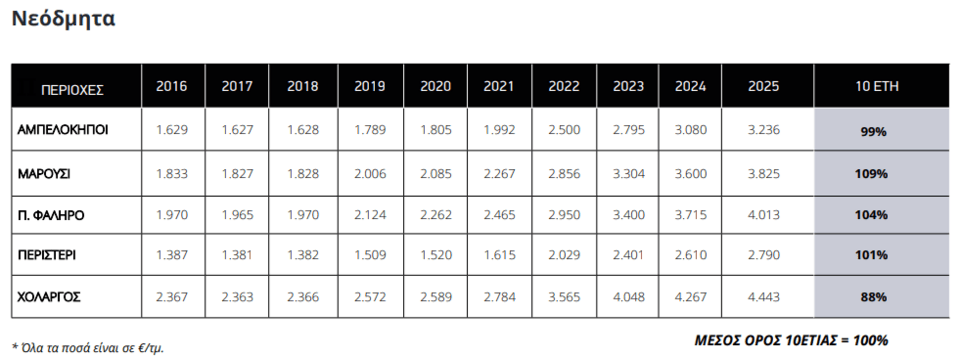 Για να αντιληφθεί κανείς πού έχουν φτάσει οι τιμές και πόσο δύσκολο είναι να καλυφθεί το «κενό» αγοραστικής δύναμης, αρκεί να αναφερθεί ότι μέσα σε μόλις 10 χρόνια καταγράφονται αυξήσεις ως ή και πάνω από 100%! Βάζοντας στο «μικροσκόπιο» τυπικά διαμερίσματα, μέσου ορόφου και δίχως θέα ή άλλα ιδιαίτερα γνωρίσματα, σε περιοχές κατ’ εξοχήν αστικές (Αμπελόκηποι, Μαρούσι, Π. Φάληρο, Περιστέρι, Χολαργός), η έρευνα της Geoaxis έδειξε ότι υπάρχει αύξηση κατά μέσο όρο 100% στα νεόδμητα και 94% στα παλαιότερα διαμερίσματα, σε σχέση με τις αξίες του 2016. Χαρακτηριστική είναι η περίπτωση ενός νεόδμητου στο Π. Φάληρο, του οποίου η τιμή πριν από δέκα χρόνια διαμορφωνόταν στα 1.970 ευρώ/τ.μ. και πλέον «παίζει» πάνω από τα 4.000 ευρώ/τ.μ.