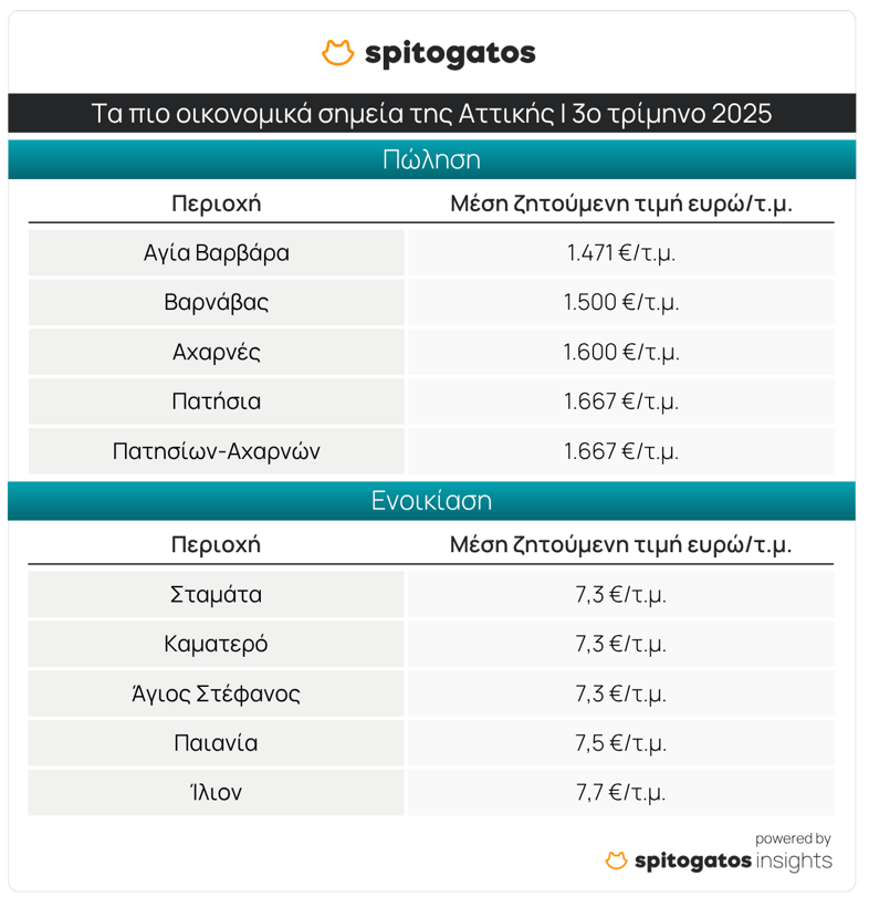 Οι ζητούμενες τιμές παραμένουν σχετικά σταθερές σε ορισμένες περιοχές της Αττικής. Συγκεκριμένα, στα Νότια Προάστια, η Νέα Σμύρνη παρουσιάζει μικρές διακυμάνσεις, ενώ αντίστοιχη εικόνα καταγράφεται στην Αγία Παρασκευή στα Βόρεια Προάστια, στη Μεταμόρφωση στα Δυτικά, όπως επίσης και στις περιοχές Κολωνάκι-Λυκαβηττός (κέντρο Αθήνας) και Καστέλλα-Πασαλιμάνι (Πειραιάς). Σχετικά σταθερές παραμένουν οι μέσες ζητούμενες τιμές (ΜΖΤ) ενοικίασης κατά το 3ο τρίμηνο του 2025 σε σχέση με την ίδια περίοδο το 2024, στις εξής περιοχές: Iστορικό κέντρο Αθήνας, Κερατσίνι, Δραπετσώνα, Καμίνια - Παλαιά Κοκκινιά, Άνοιξη και στη Βάρη-Βάρκιζα.