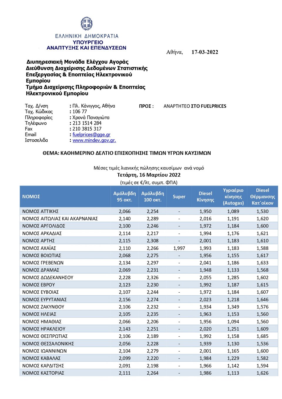 Σε αυτά, τα προ εισβολής επίπεδα, υποχωρεί η τιμή της βενζίνης με την επιδότηση των 0,22 ευρώ, έχοντας φτάσει σε μέσα επίπεδα την απίστευτη τιμή των 2,11 ευρώ.