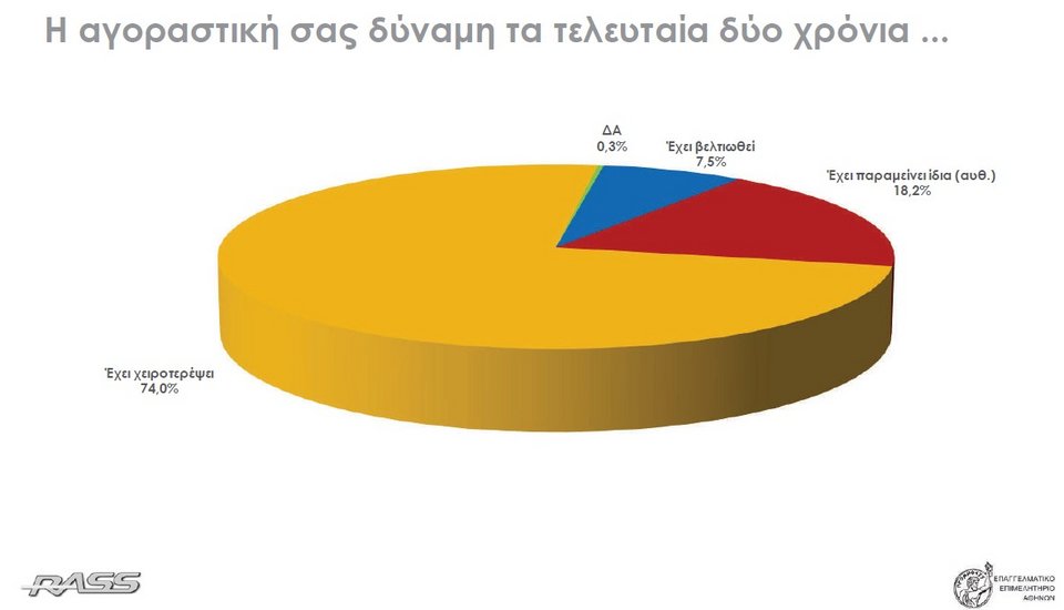Οικονομική πίεση, περιορισμένη αγοραστική δύναμη και αβεβαιότητα χαρακτηρίζουν σήμερα τα νοικοκυριά της Αττικής, όπως προκύπτει από έρευνα της RASS για το Επαγγελματικό Επιμελητήριο Αθηνών (ΕΕΑ).