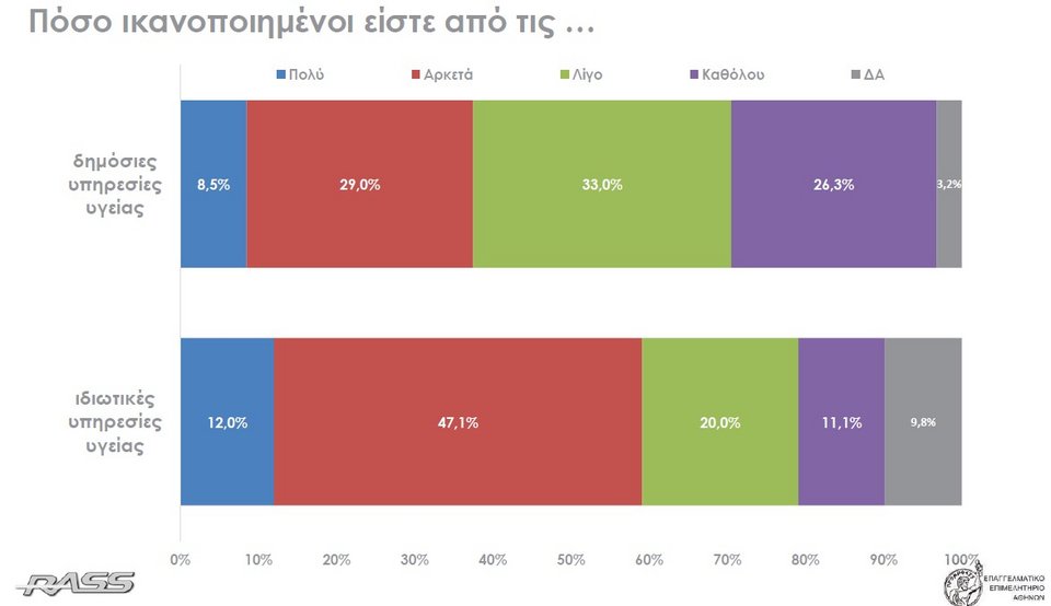 Στον τομέα της υγείας, καταγράφεται σαφής διαφοροποίηση μεταξύ δημόσιων και ιδιωτικών υπηρεσιών. Περίπου 6 στους 10 πολίτες δηλώνουν ικανοποιημένοι από τις ιδιωτικές υπηρεσίες υγείας, ενώ μόλις 4 στους 10 από τις δημόσιες. Παρά τη χαμηλότερη ικανοποίηση, το δημόσιο σύστημα παραμένει βασικός πυλώνας νοσηλείας, κυρίως λόγω κόστους και καθολικής πρόσβασης.