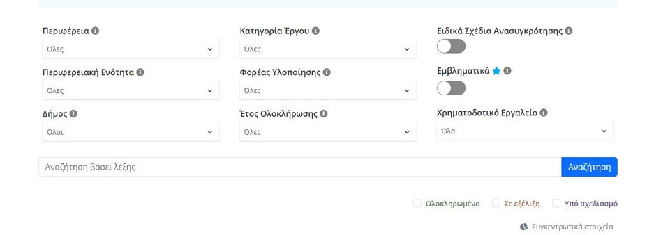 Mέσα από την πλατφόρμα, οι πολίτες έχουν την δυνατότητα να επιλέξουν την περιφέρεια και τον δήμο που τους ενδιαφέρει, την κατηγορία του έργου και τον φορέα υλοποίησης.