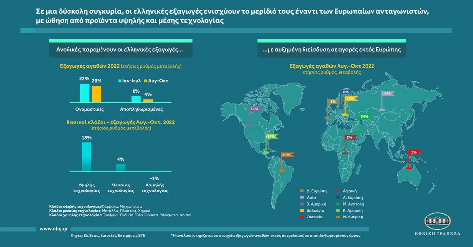 Αναλυτικότερα, όπως επισημαίνεται στην μελέτη της Εθνικής Τράπεζας, σημαντική άνοδο της τάξης του 7% ετησίως σημείωσαν οι ελληνικές εξαγωγές αγαθών σε αποπληθωρισμένους όρους κατά το πρώτο δεκάμηνο του 2022 - ποσοστό σχεδόν διπλάσιο από το μέσο όρο της προηγούμενης δεκαετίας. Σημειώνεται ότι η αντίστοιχη ονομαστική άνοδος ήταν της τάξης του 22%, με τα 2/3 να είναι αποτέλεσμα ανοδικών τιμών (αντικατοπτρίζοντας σε μεγάλο βαθμό «εισαγόμενες» πληθωριστικές πιέσεις στο κόστος πρώτων υλών).