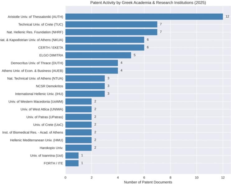 Τα ακαδημαϊκά και ερευνητικά Ιδρύματα αποτελούν τον ισχυρότερο μοχλό παραγωγής τεχνολογίας. Πρωταγωνιστές σε δημοσιευμένα Διπλώματα Ευρεσιτεχνίας είναι: