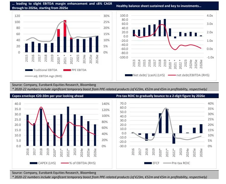 Η χρηματιστηριακή εκτιμά ότι ο Όμιλος βρίσκεται σε ευνοϊκή θέση για να αξιοποιήσει τις δυνατότητες αποδοτικότητας κόστους και την αύξηση του όγκου πωλήσεων σε μεσοπρόθεσμο ορίζοντα. Θα συνεχίσει να αναπτύσσει τις δραστηριότητές του με βιώσιμο τρόπο, ενισχύοντας περαιτέρω τα μερίδια αγοράς του.
