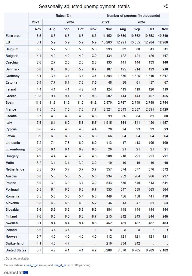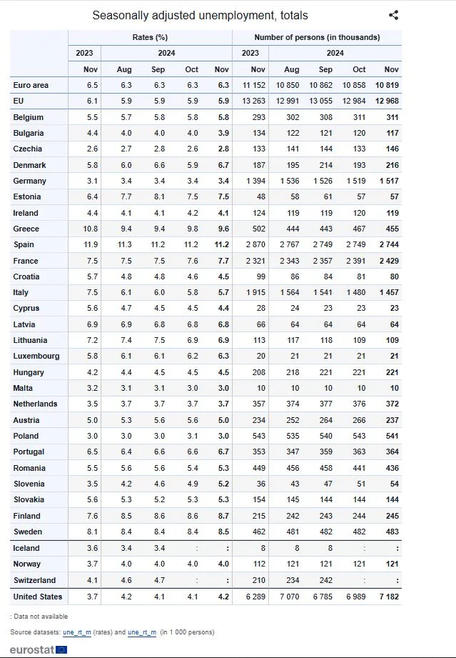 Η Eurostat εκτιμά ότι 12,968 εκατομμύρια άτομα στην ΕΕ, εκ των οποίων 10,819 εκατομμύρια στη ζώνη του ευρώ, ήταν άνεργοι τον Νοέμβριο του 2024.