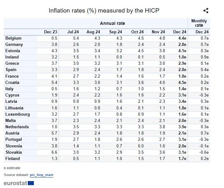 Ο ετήσιος πληθωρισμός της ζώνης του ευρώ αναμένεται να διαμορφωθεί στο 2,4% τον Δεκέμβριο του 2024, από 2,2% τον Νοέμβριο, σύμφωνα με έκτακτη εκτίμηση της Eurostat, της στατιστικής υπηρεσίας της Ευρωπαϊκής Ένωσης.