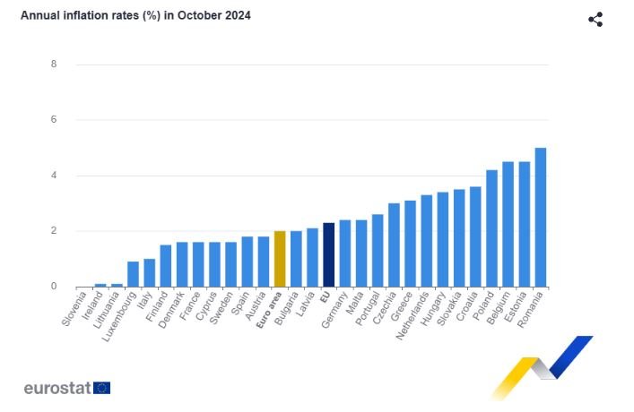 Ένα χρόνο νωρίτερα, ο ρυθμός ήταν 2,9%. Ο ετήσιος πληθωρισμός της Ευρωπαϊκής Ένωσης ήταν 2,3% τον Οκτώβριο του 2024, από 2,1% τον Σεπτέμβριο. Ένα χρόνο νωρίτερα, το ποσοστό ήταν 3,6%. Τα στοιχεία αυτά δημοσιεύονται από τη Eurostat, τη στατιστική υπηρεσία της Ευρωπαϊκής Ένωσης.