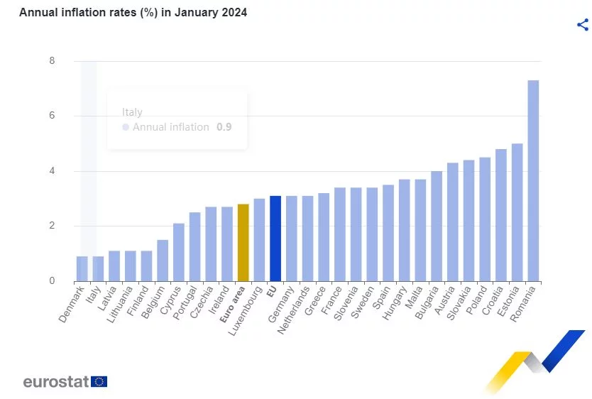 Τα χαμηλότερα ετήσια ποσοστά καταγράφηκαν στη Δανία, την Ιταλία (και οι δύο 0,9%), τη Λετονία, τη Λιθουανία και τη Φινλανδία (και οι δύο 1,1%). Τα υψηλότερα ετήσια ποσοστά καταγράφηκαν στη Ρουμανία (7,3%), την Εσθονία (5,0%) και την Κροατία (4,8%). Σε σύγκριση με τον Δεκέμβριο, ο ετήσιος πληθωρισμός μειώθηκε σε δεκαπέντε κράτη μέλη, παρέμεινε σταθερός σε ένα και αυξήθηκε σε έντεκα.