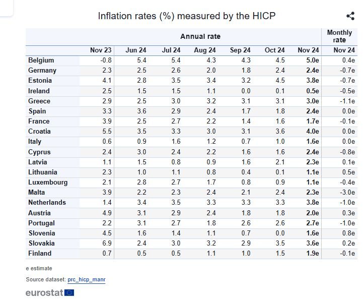 Ο ετήσιος πληθωρισμός της ζώνης του ευρώ αναμένεται να διαμορφωθεί στο 2,3% τον Νοέμβριο του 2024, από 2,0% τον Οκτώβριο, σύμφωνα με τα προκαταρκτικά στοιχεία της Eurostat, τη στατιστική υπηρεσία της Ευρωπαϊκής Ένωσης.