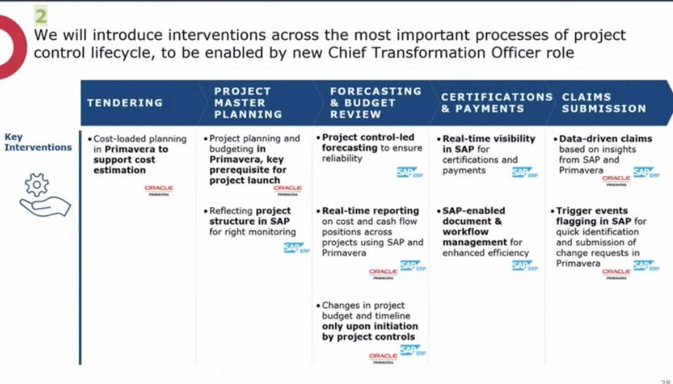 Επιπρόσθετα, αναφέρθηκε στη σύνδεση SAP και Primavera και τόνισε ότι έτσι θα «ξέρουμε με ακρίβεια τα κόστη, το χρόνο, το προσωπικό που χρειάζεται για κάθε έργο και τα υλικά, από την στιγμή υποβολής μιας προσφοράς.