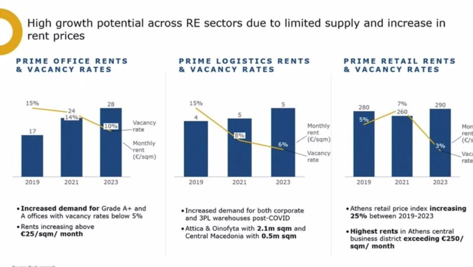 Για το Real Estate σημειώσε ότι «αποκτήσαμε 56 ακίνητα που παράγουν ετησίως 40 εκ. EBITDA. Θα προχωρήσουμε σε εξαγορές και άλλων prime ακινήτων».