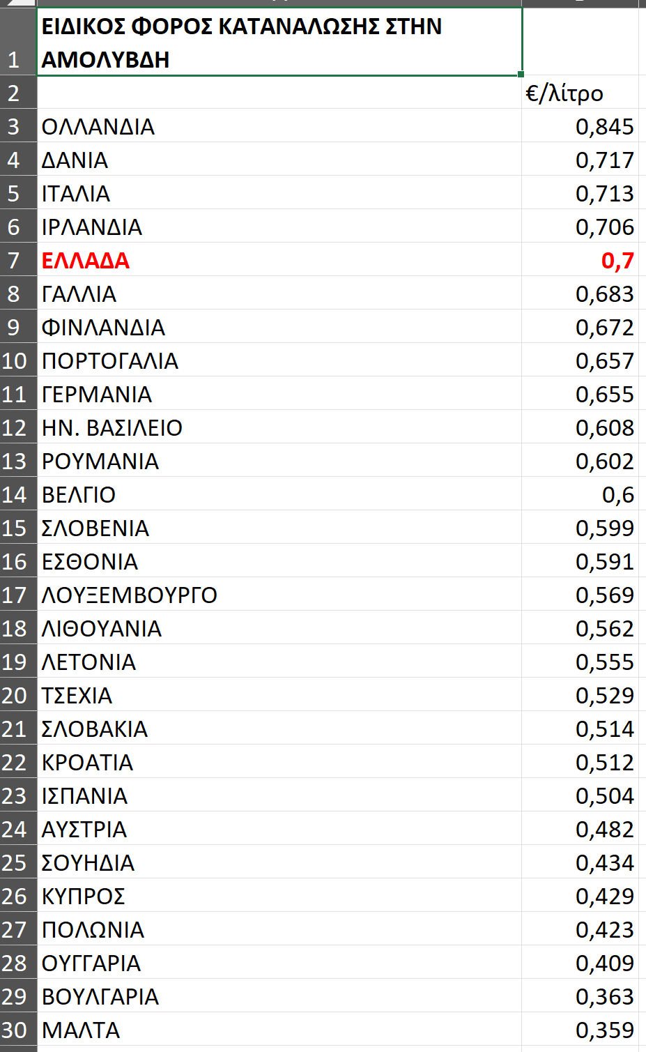 Η Ευρωπαϊκή Ένωση απαιτεί από τα κράτη- μέλη να επιβάλλουν ελάχιστο ΕΦΚ 0,359 ευρώ ανά λίτρο αμόλυβδης βενζίνης. Μόνο, όμως, η Μάλτα τηρεί τον ελάχιστο συντελεστή, ενώ όλα τα άλλα κράτη- μέλη της ΕΕ επιβάλλουν υψηλότερους ειδικούς φόρους κατανάλωσης. Με ελάχιστο συντελεστή 0,359 ευρώ ανά λίτρο, η Μάλτα έχει τον χαμηλότερο φόρο βενζίνης, ακολουθούμενη από τη Βουλγαρία στα 0,363 € ανά λίτρο και την Ουγγαρία στα 0,409 € ανά λίτρο. Στον αντίποδα, η Ολλανδία επιβάλλει τον υψηλότερο ΕΦΚ στη βενζίνη, στα 0,845 € ανά λίτρο, ακολουθούμενη από τη Δανία στα 0,717 € ανά λίτρο και την Ιταλία στα 0,713 € ανά λίτρο. Η Ελλάδα, η οποία μέχρι το 2019 είχε τον 3ο υψηλότερο ΕΦΚ στη βενζίνη, μετά τις αναπροσαρμογές που έκαναν άλλα κράτη- μέλη, βρίσκεται πλέον στην 5η θέση της ευρωπαϊκής κατάταξης, με 0,70 ευρώ. Είναι ενδεικτικό ότι το 2019 η Ιρλανδία είχε ΕΦΚ 0,59 ευρώ και βρισκόταν στο 12ο σκαλοπάτι, αλλά πλέον με 0,706 ευρώ κατατάσσεται στην 4η θέση, πάνω από την Ελλάδα.