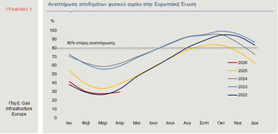 Τα τελευταία στοιχεία δείχνουν ότι τα ποσοστά πλήρωσης των ευρωπαϊκών αποθηκών φυσικού αερίου βρίσκονται στο 29,55%, όταν πέρσι τέτοια εποχή βρίσκονταν στο 35,80%.