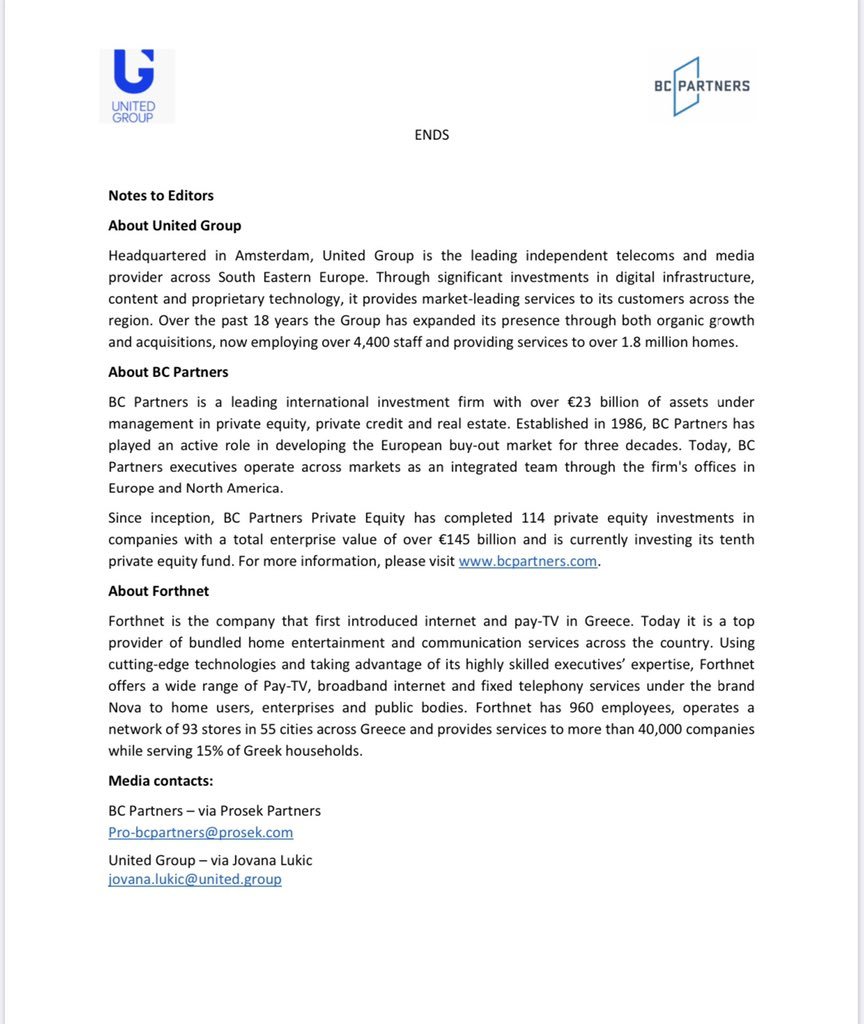 «Κατόπιν σχετικής ενημέρωσης από τα συμβαλλόμενα μέρη, η εταιρεία Forthnet Α.Ε. (η «Εταιρεία») βρίσκεται στην ευχάριστη θέση να ανακοινώσει ότι, σε συνέχεια της επιτυχούς κατάληξης των αποκλειστικών διαπραγματεύσεων μεταξύ της Τράπεζας Πειραιώς, της Εθνικής Τράπεζας της Ελλάδος, της Alpha Bank και της Attica Bank (οι «Τράπεζες» ή οι «Πωλητές» και, ο καθένας, ο «Πωλητής») και του Ομίλου United (ο «Αγοραστής» και, μαζί με τους Πωλητές, τα «Συμβαλλόμενα Μέρη»), οι Πωλητές συμφώνησαν να πωλήσουν, και ο Αγοραστής συμφώνησε να αποκτήσει, (i) όλες τις υφιστάμενες απαιτήσεις που κατέχουν οι Πωλητές σε βάρος της Εταιρείας (και της σημαντικότερης θυγατρικής της Forthnet Media A.E.), οι οποίες κατά προσέγγιση ανέρχονται σε ποσό ευρώ 281 εκ. (οι «Δανειακές Απαιτήσεις»), (ii) όλες τις μετατρέψιμες ομολογίες που κατέχουν οι Πωλητές με συνολικό υπόλοιπο κεφαλαίου κατά προσέγγιση ευρώ 52 εκ. (οι «Μετατρέψιμες Ομολογίες») και (iii) όλες τις κοινές μετοχές της Εταιρείας τις οποίες κατέχουν σήμερα οι Πωλητές (οι «Πωλούμενες Μετοχές») (συνολικά, η «Συναλλαγή»). Περαιτέρω, οι Πωλητές δύνανται υπό ορισμένες περιστάσεις να διατηρήσουν αριθμό των Πωλουμένων Μετοχών. Η Συναλλαγή υπόκειται στην προηγούμενη λήψη των αναγκαίων κανονιστικών εγκρίσεων και τους συνήθεις όρους ολοκλήρωσης (οι «Όροι»).