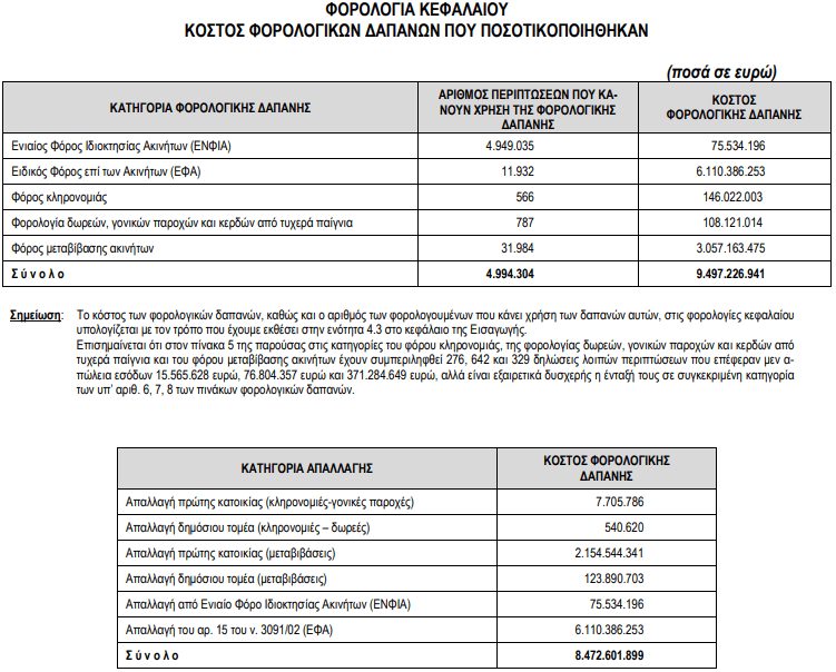 Αυξημένη είναι και η φορολογική δαπάνη για τις απαλλαγές από τον Ειδικό Φόρο Ακινήτων, καθώς φέτος προβλέπονται 6,110 δισ ευρώ, έναντι 5,348 δισ ευρώ πέρσι.