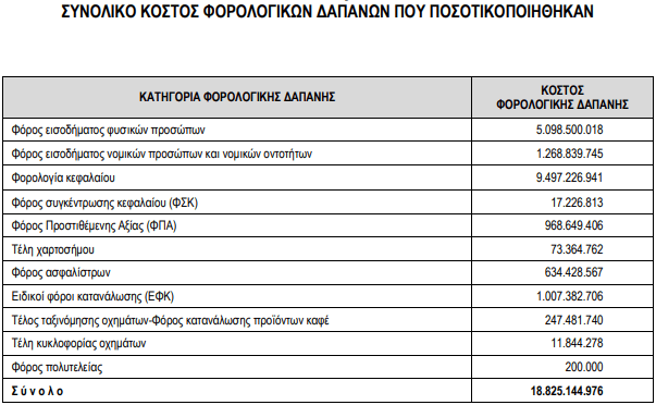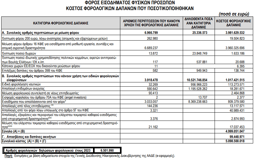 Το σύνολο των φοροαπαλλαγών υπολογίζεται σε 5,098 δισ ευρώ, έναντι 5,396 δισ ευρώ πέρσι. Το μεγαλύτερο μέρος αυτής της φορολογικής δαπάνης αφορά στο αφορολόγητο μισθωτών, συνταξιούχων, αγροτών και υπολογίζεται σε 3,960 δισ ευρώ (περίπου 100 εκ ευρώ παραπάνω