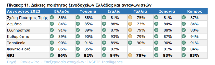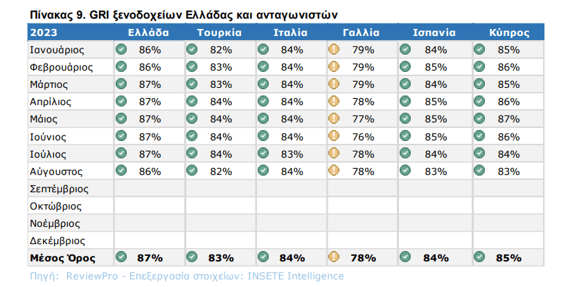 Συγκεκριμένα, η Ελλάδα καταλαμβάνει την πρώτη θέση τόσο τον Αύγουστο όσο και συνολικά το 2023, με 86% και 87% αντίστοιχα, στον γενικό δείκτη ικανοποίησης.