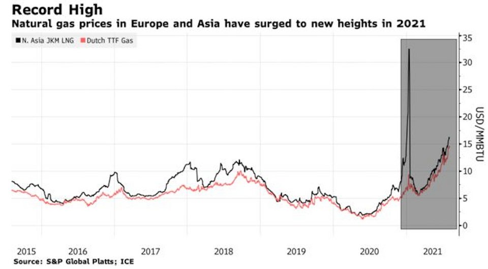 Αν στα παραπάνω προσθέσει κανείς την έλλειψη νέων επενδύσεων σε υγροποιημένο αέριο, τα προβλήματα που προκαλούν φυσικές καταστροφές στην παραγωγή αερίου -π.χ. ο πρόσφατος κυκλώνας στις ΗΠΑ-, την ανεπάρκεια ενέργειας από ΑΠΕ, αλλά και τα γεωπολιτικά παιχνίδια στην Ευρώπη, με τους Ρώσους να κλείνουν τη στρόφιγγα ως αντίμετρο στις οικονομικές κυρώσεις των Ευρωπαίων, έχει την πλήρη εικόνα των αιτίων που «σπρώχνουν» τις τιμές του φυσικού αερίου σε πρωτόγνωρα ύψη και απειλούν με παρατεταμένα ηλεκτροσόκ τους καταναλωτές.