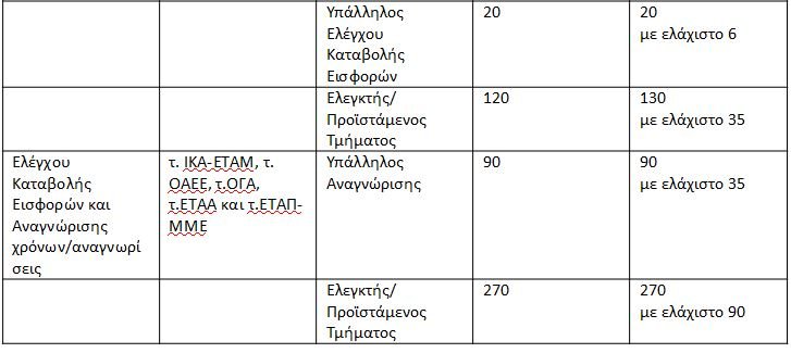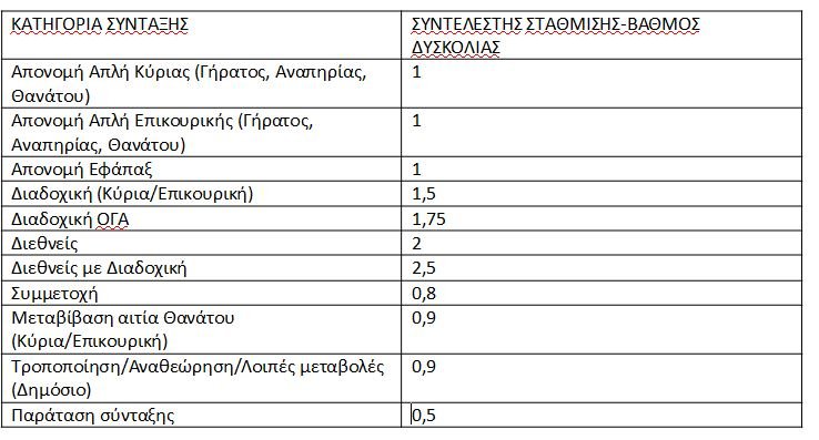Ειδικά για τους προϊστάμενους τμημάτων/ελεγκτές του κλιμακίου-ομάδας η απόδοση του ελέγχου ορίζεται ίση με το τριπλάσιο της απόδοσης υπαλλήλου του αντίστοιχου τέως Φορέα. Ως ήταν αναμενόμενο, τον υψηλότερο δείκτη δυσκολίας έχει η εκκαθάριση των φακέλων διαδοχικής ασφάλισης, όπως προκύπτει από τους συντελεστές βαρύτητας ανά υπόθεση: