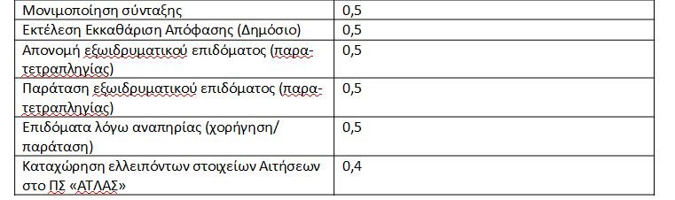 Ειδικά όσον αφορά στα Κλιμάκια Εκκαθάρισης Συντάξεων,η ατομική μηνιαία απόδοση θα αφορά στην καταχώρηση στοιχείων παλαιών αιτήσεων στο Πληροφοριακό Σύστημα «ΑΤΛΑΣ». Η μηνιαία απόδοση του Εκκαθαριστή προσδιορίζεται στην ολοκλήρωση της καταχώρησης 80 παλαιών αιτήσεων στο πλαίσιο του κλιμακίου με ελάχιστη απόδοση τις 40. Η απόδοση εκτός κλιμακίου ορίζεται ως η εκκαθάριση των οριστικών αποφάσεων συνταξιοδότησης οι οποίες εκδίδονται συνολικά κάθε μήνα από τις περιφερειακές υπηρεσίες απονομής συντάξεων, τόσο κατά τη διάρκεια του τακτικού υπηρεσιακού ωραρίου και της υπερωριακής απασχόλησης, όσο και στο πλαίσιο της απόδοσης του κλιμακίου απονομής συντάξεων.