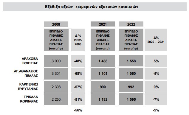 Αναλυτικότερα, την μεγαλύτερη μείωση παρουσιάζει ο Άγιος Αθανάσιος όπου από 3.301 euro/τμ το 2008 η αξία κυμαίνεται σήμερα στα 1.050 euro/τμ (-68%) και ακολουθούν, το Καρπενήσι από 2.308 euro/τμ το 2008 σήμερα στα 992 euro/τμ (-57%), τα Τρίκαλα Κορινθίας από 2.250 euro/τμ το 2008 σήμερα στα 1.095 euro/τμ (-51%) και τέλος η Αράχωβα από 3.000 euro/τμ το 2008 σήμερα στα 1.558 euro/τμ (-48%)