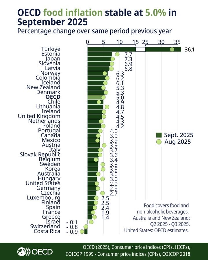 Σύμφωνα με τα τελευταία στοιχεία του ΟΟΣΑ για τον Σεπτέμβριο 2025, ο πληθωρισμός στα τρόφιμα στην Ελλάδα διαμορφώθηκε στο 1,4%, έναντι 3,5% στον μέσο όρο της ΕΕ και 5% στις χώρες του ΟΟΣΑ.