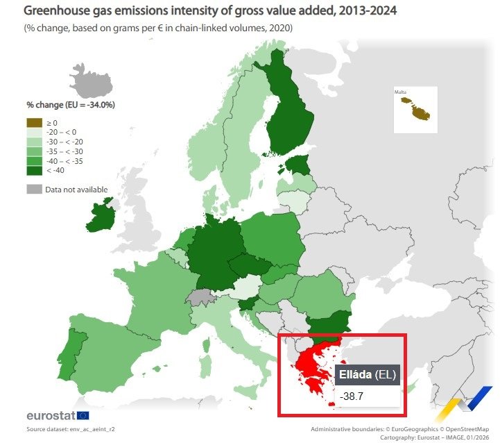 Η μείωση της έντασης των εκπομπών αερίων του θερμοκηπίου στην ΕΕ κατά 34% από το 2013 έως το 2024 μεταφράζεται στη μείωση των εκπομπών με ταυτόχρονη αύξηση της προστιθέμενης αξίας της ευρωπαϊκής οικονομίας (+20%).