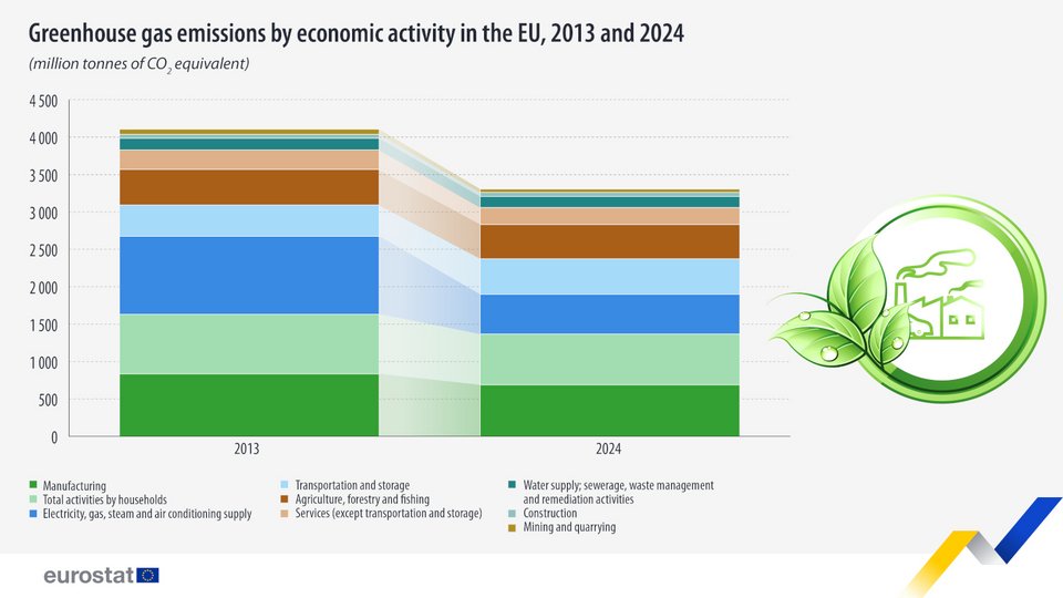 Το 2024, οι εκπομπές αερίων του θερμοκηπίου στην ΕΕ από οικονομική δραστηριότητα και νοικοκυριά ανήλθαν συνολικά σε 3,3 δισεκατομμύρια τόνους ισοδυνάμων διοξειδίου του άνθρακα (CO2). Αυτό αντιπροσωπεύει μείωση 1% σε σύγκριση με το 2023 και μείωση 20% σε σύγκριση με το 2013.