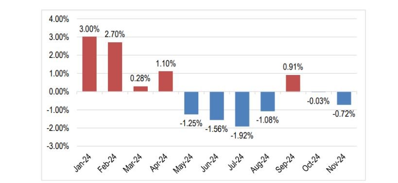 Η ίδια έρευνα διαπιστώνει σχεδόν πλήρη σταθεροποίηση των τιμών στο ενδεκάμηνο 2024 - κατά μέσο όρο +0,05% - σε σχέση με το ενδεκάμηνο 2023.