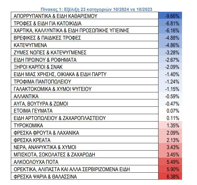 Μεγαλύτερες μειώσεις τιμών καταγράφονται στις κατηγορίες: απορρυπαντικά και είδη καθαρισμού (-9,66%), τροφές και είδη για κατοικίδια (-6,81%), χαρτικά, καλλυντικά και είδη προσωπικής υγιεινής (-6,16%), βρεφικές και παιδικές τροφές (-4,86%), κατεψυγμένα είδη (-4,86%).