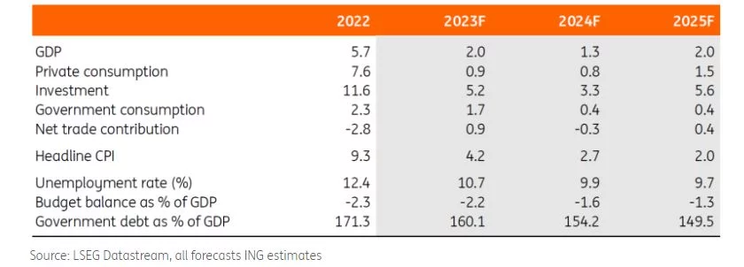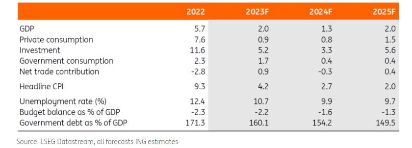 Πέρα από την καθαρή επίδραση της μείωσης του κόστους εξυπηρέτησης του χρέους, η ανάκτηση της επενδυτικής βαθμίδας θα μπορούσε επίσης να βοηθήσει την Ελλάδα, καθιστώντας την πιο ελκυστική για άμεσες ξένες επενδύσεις. Κάτι τέτοιο θα μπορούσε να αναθεωρήσει τις προβλέψεις της ING για το ελληνικό ΑΕΠ προς τα πάνω, οι οποίες επί του παρόντος διαμορφώνονται στο 1,3% το 2024.